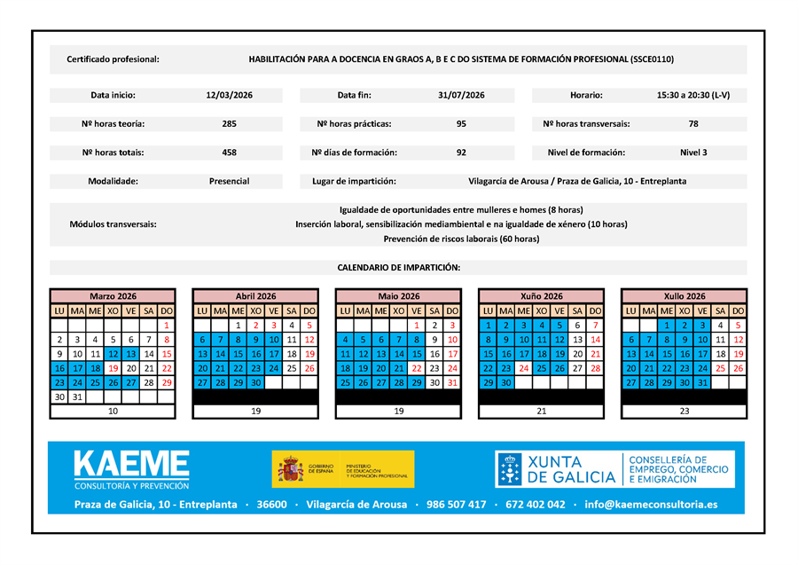 - Duración: 458 horas con prácticas en centros de traballo.