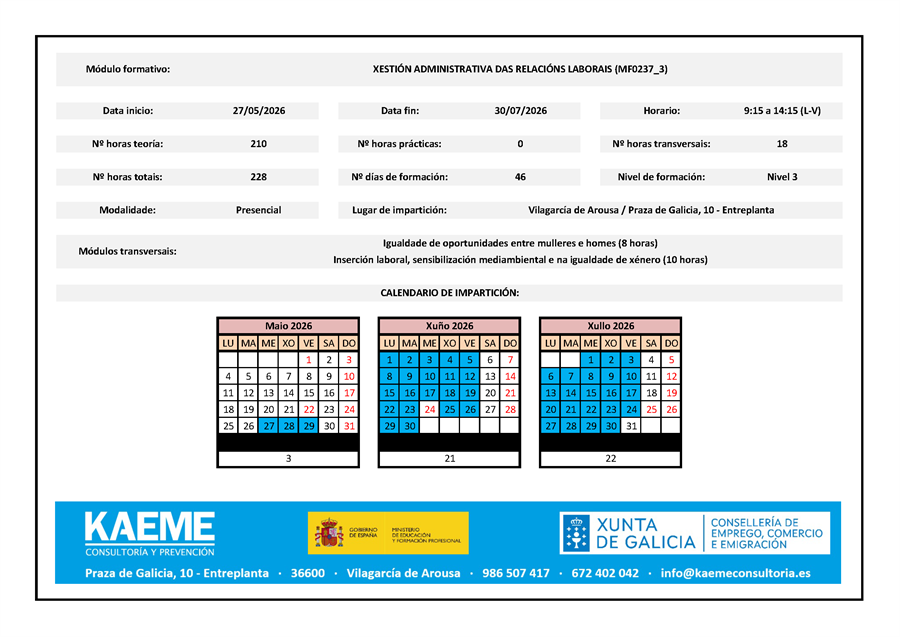 Máis información: 986 507 417 - 672 402 042 - info@kaemeconsultoria.es