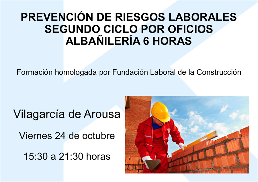 Curso PREVENCIÓN DE RIESGOS LABORALES. ALBAÑILERÍA 6 horas - Viernes 24 de octubre en Vilagarcía de Arousa (PONTEVEDRA)