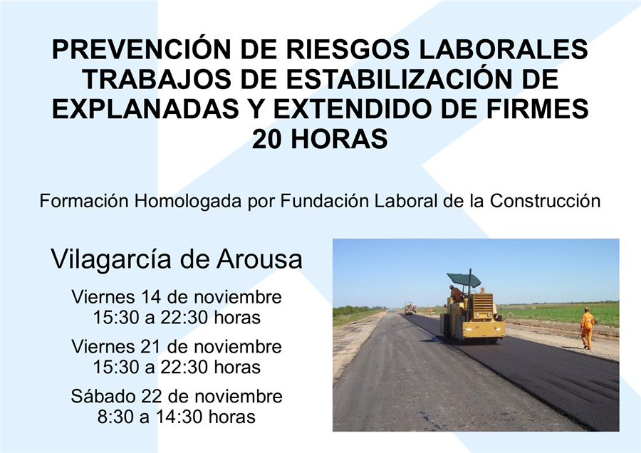 Curso PREVENCIÓN DE RIESGOS LABORALES. ESTABILIZACIÓN EXPLANADAS Y EXTENDIDO FIRMES 20 horas - 14+21+22 noviembre - Vilagarcía de Arousa (PONTEVEDRA)