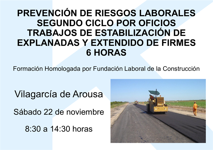 Curso PREVENCIÓN DE RIESGOS LABORALES. ESTABILIZACIÓN EXPLANADAS Y EXTENDIDO FIRMES 6 horas - Sábado 22 noviembre - Vilagarcía de Arousa (PONTEVEDRA)