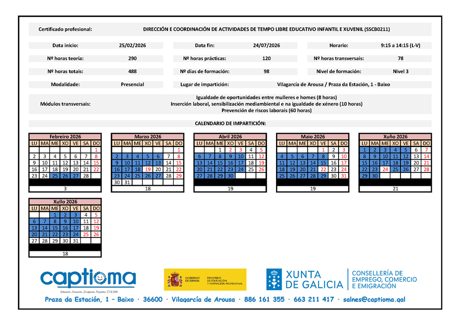 · Do 25/02/2026 ao 24/07/2026, de 9:15 a 14:15 horas (de luns a venres).