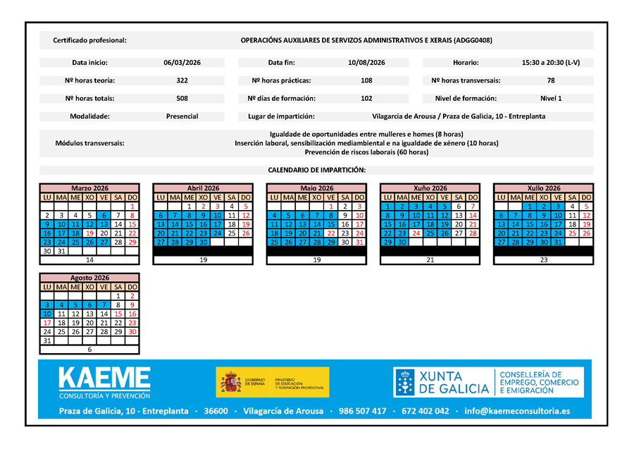 · Do 06/03/2026 ao 10/08/2026, de 15:30 a 20:30 horas (de luns a venres).