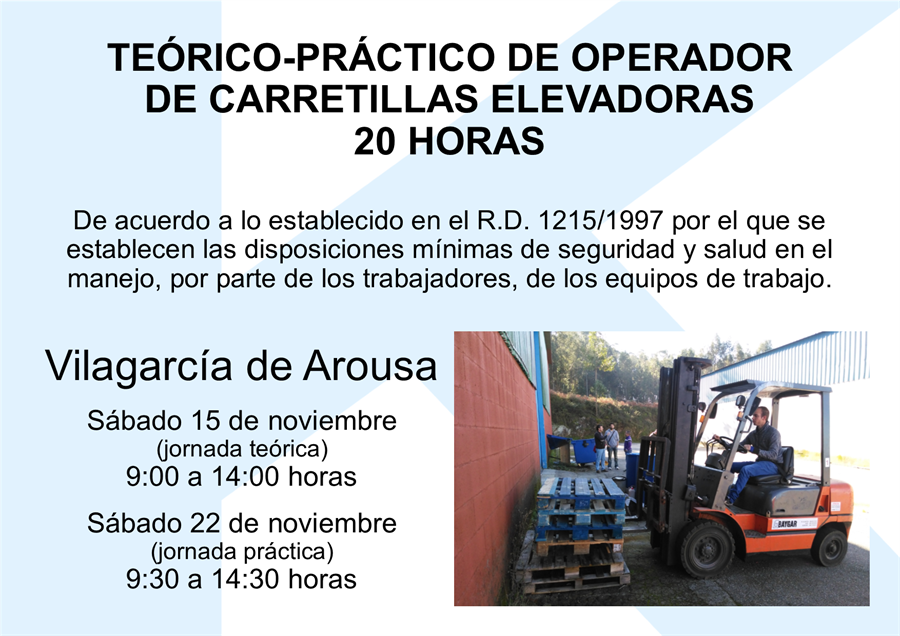 Curso TEÓRICO-PRÁCTICO DE OPERADOR DE CARRETILLAS ELEVADORAS 20 horas - Sábados 15 y 22 de noviembre en Vilagarcía de Arousa (PONTEVEDRA)